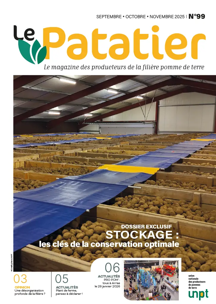 Distribué gratuitement à plus de 10 000 producteurs de pommes de terre, chaque trimestre, le magazine papier « Le Patatier » est la référence de la filière depuis 2002. A chaque numéro, retrouvez des contenus exclusifs traitant l’ensemble des débouchés de la pomme de terre (frais, industrie, fécule) ainsi que les dernières innovations techniques et agronomiques !