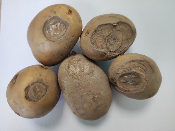 Les symptômes sont visibles à condition d’un œil attentif : mildiou avec ses taches violacées et sa chair rouillée ; fusariose et gangrène qui provoquent affaissements et cavités sèches ; bactéries (Pectobacterium, Dickeya) donnant des tubercules mous, liquéfiés, à odeur nauséabonde ; pythium (pourriture aqueuse) avec tissus déliquescents et odeur de hareng ; maladies de présentation comme la gale argentée, la dartrose ou le rhizoctone brun.
